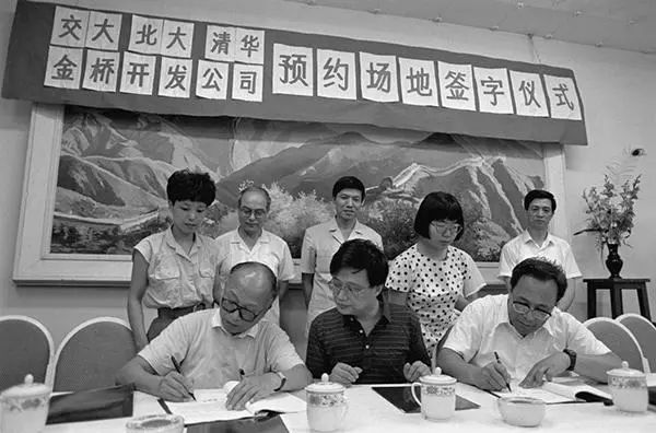 1991年8月8日,上海交通大学、北京大学、清华大学与上海浦东开发区金桥出口加工区开发公司签署预约场地协议书,三所大学将在金桥开发区内联合建立科技开发基地。新华社 资料图