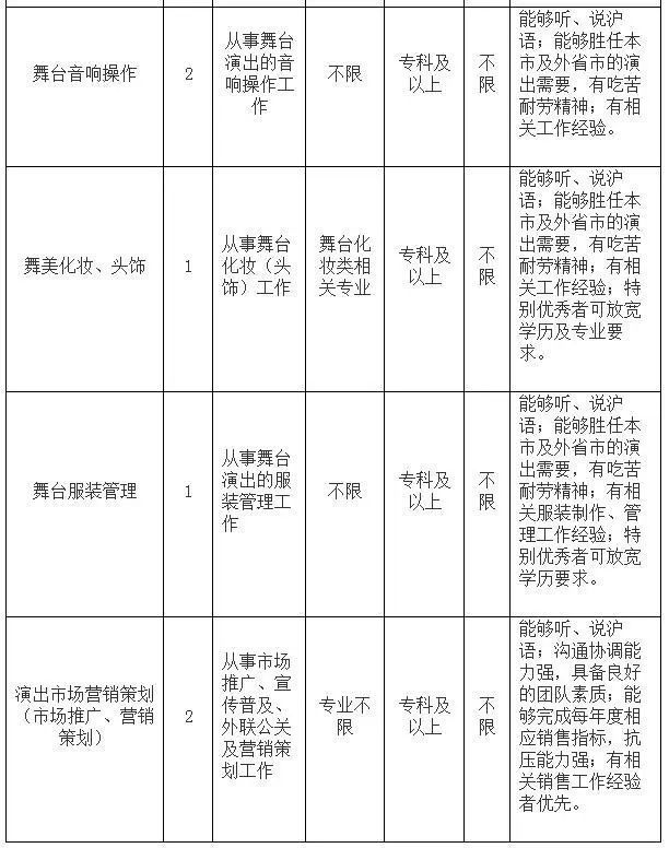 演员、舞美相关岗位以面试与现场考核实践操作为主;营销岗位以面试与笔试为主。笔试、现场考核主要测试岗位专业知识、业务能力和综合素质。面试采取答辩、结构化面试、情景模拟等多种方式进行。