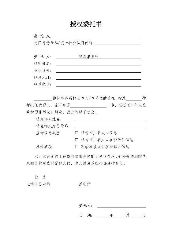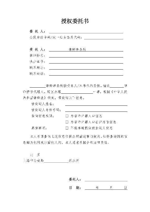 2.律师查询外省市户籍人员的人口信息、外省市户籍人员的在沪居住信息,应提供《律师事务所介绍信》《律师执业证》及《授权委托书》(《授权委托书》格式样本见附件,须由自然人委托人签字或者法人、非法人组织委托人盖章)。