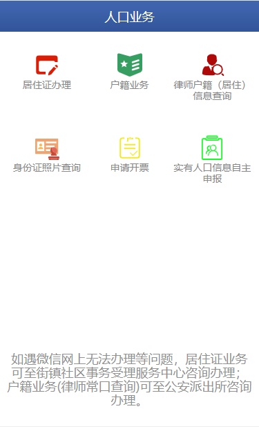 1.鼓励律师通过“上海公安人口管理”微信公众号,使用线上查询功能(预计6月12日上线试运行),经身份认证后登陆系统,按照系统提示输入被查询人的准确姓名和公民身份号码,上传注明查询事由和本提示第二条所述材料,即可实现自助查询。线上查询功能实时反馈本市户籍人员的人口信息、外省市户籍人员的在沪居住信息,次日反馈外省市户籍人员的人口信息。