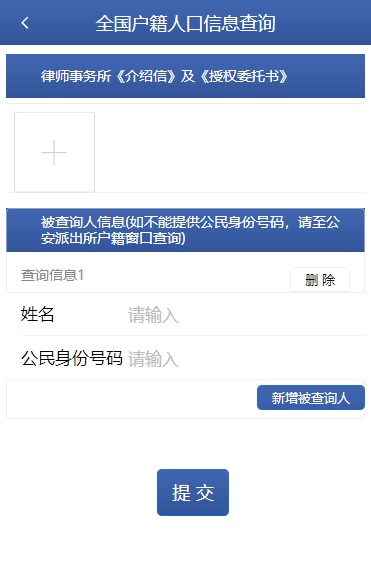 4.2律师无法提供公民身份号码,请至公安派出所户籍窗口查询。输入被查询人姓名、公民身份号码,多个被查询人点击“新增被查询人”按钮。点击“查询”按钮。