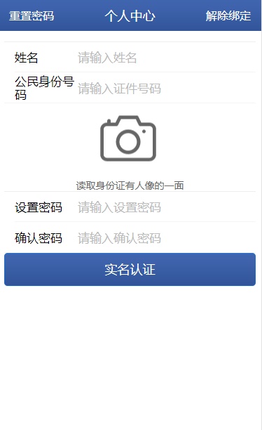 2、进入认证界面后,律师点击“相机图片”,可通过上传“身份证正面”识别姓名和证件号码,并设置密码,密码长度应大于8位,输入密码后点击“实名认证”