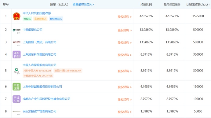 公司股东包括中华人民共和国财政部、中国烟草、中国人寿、上海国盛集团、浦东科创集团等,其中,财政部出资152.5亿元,持股比例42.6573%,为第一大股东。浦东科创集团出资30亿元,持股比例8.3916%,为第四大股东。
