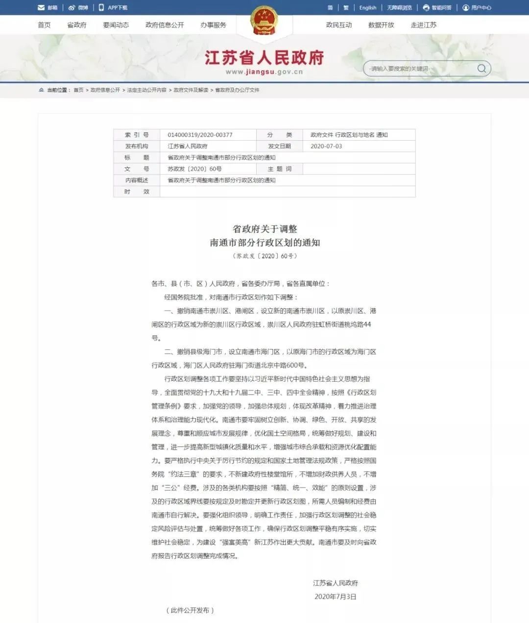 江苏省政府官网昨天发布消息,经国务院批准,将对南通市行政区划作如下调整: