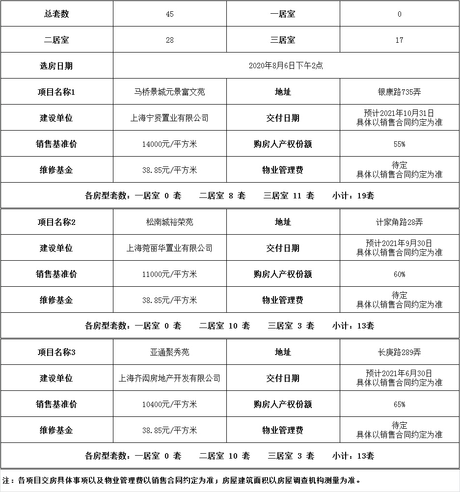 根据市房管局房源统筹安排,本批次房源共有3处,其中1处位于闵行,另2处位于松江和奉贤,分别是马桥景城元景富文苑、松南城裕荣苑、亚通聚秀苑。房源总套数为45套,其中二居室28套,三居室17套。