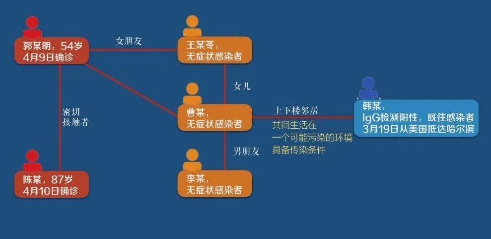 4月15日晚间,黑龙江日报微信公众号发布消息:记者从哈尔滨市疫情防控指挥部核实,4月10日公布的哈尔滨市新增本土确诊病例郭某和3例无症状感染者,其感染溯源中提到的曹某楼上楼下邻居——从美国入境人员韩某,系女性,22岁,是从美国回哈的留学生。此前,网络盛传的韩某为男性,是误传。