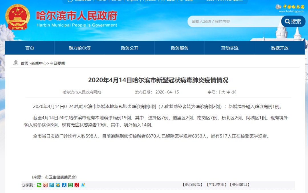 据黑龙江省卫生健康委员会最新疫情通报,2020年4月14日0-24时,哈尔滨市新增本地新冠肺炎确诊病例8例(无症状感染者转为确诊病例2例);新增境外输入确诊病例1例。截至4月14日24时,该市现有本地确诊病例19例,境外输入确诊病例3例,无症状感染者19例(境外输入14例)。