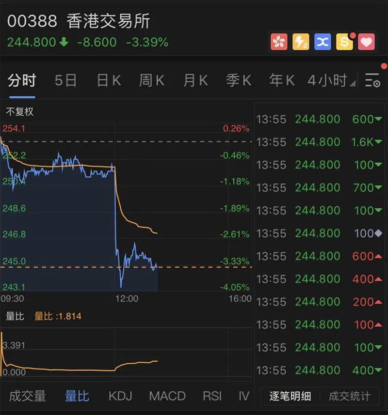 受李小加不再续约及一季度盈利下降等的影响,午后开盘,港交所股价直线跳水,跌幅由午间收盘时不到1%扩大至3.3%。